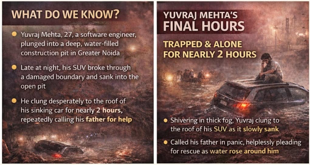 Yuvraj Mehta was returning home late one foggy night in Greater Noida when his SUV broke through a damaged boundary and plunged into a deep, water filled construction pit, turning an ordinary drive into a nightmare. Unaware that this would be his last day alive, he called his father in desperation and cried out for help only to spend nearly two hours clinging to the roof of his sinking car amid dense fog and failed rescue attempts.