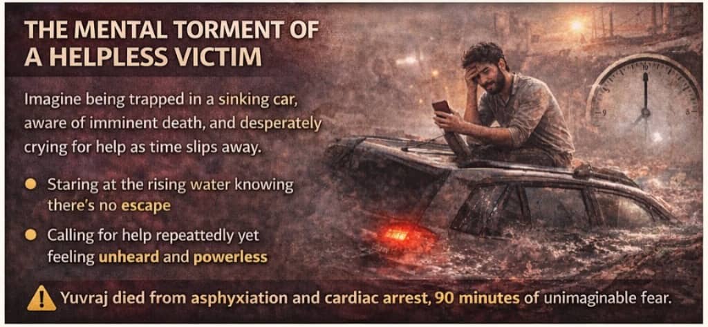 A cry that went unheard, a father who stood helpless watching his one and only son dying and a team of rescue officers who couldn't save a young man from drowing - the story will break your heart, but it also highlights a crucial aspect often overlooked: the mental and emotional torment a person experiences in the face of imminent death. The anxiety, panic, and helplessness Yuvraj felt in those final hours demonstrate how extreme stress can overwhelm both mind and body during such times when you know that the end is nearing and that there is no way out!
