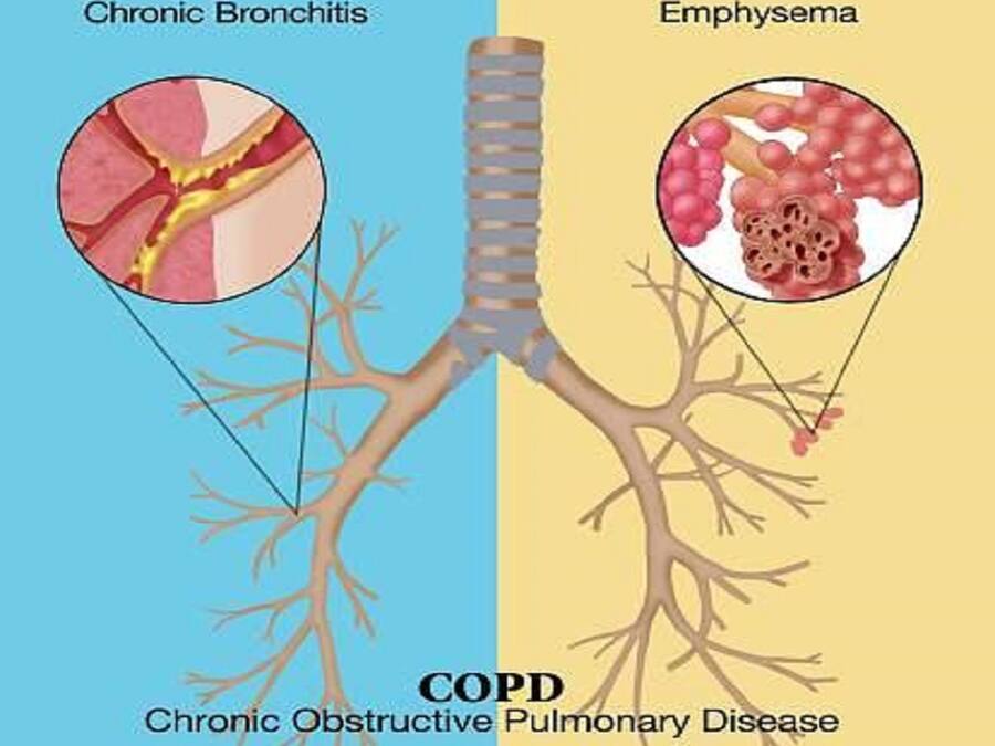 In medical terms, COPD, or chronic obstructive pulmonary disease, is an umbrella term for two primary conditions: chronic bronchitis and emphysema. Both these conditions make it harder for the patient to breathe air in and push air out, which means the patient is not able to take enough oxygen in or has a hard time breathing out, which means carbon dioxide remains in the body. While emphysema destroys the air sacs in the lungs, which interferes with outward airflow, bronchitis causes inflammation and narrowing of the bronchial tubes, allowing mucus to build up.