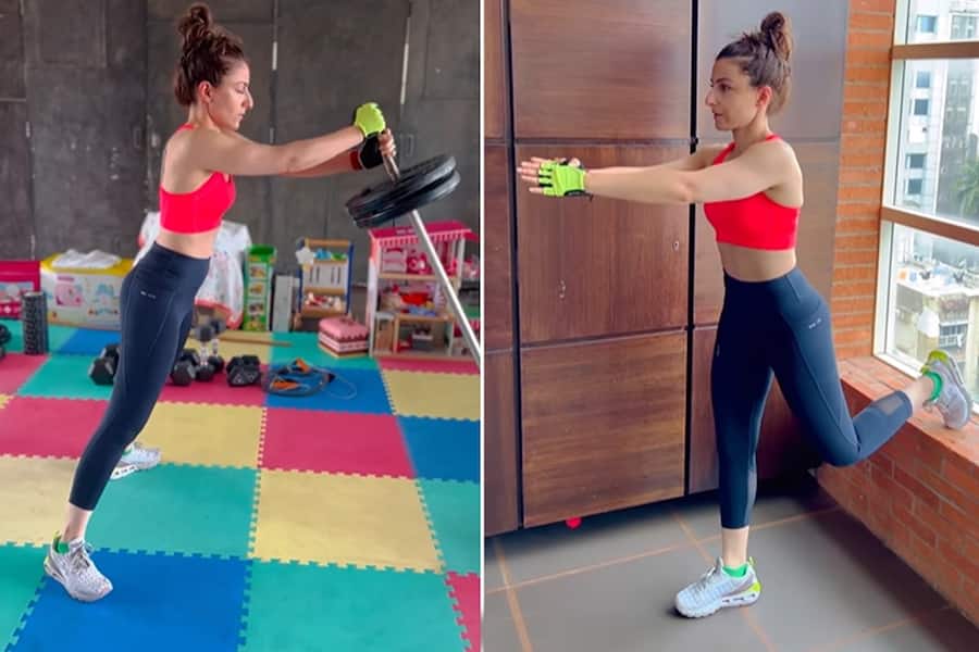 Soha is seen practising squats while clutching a gym rod in the first few seconds of the video. The star can be seen repeatedly squatting in her homeroom. Later in the video, Soha can be seen performing squats with one leg on the window and balancing on the other. She captioned the video, "The hamstrings of my heart."
