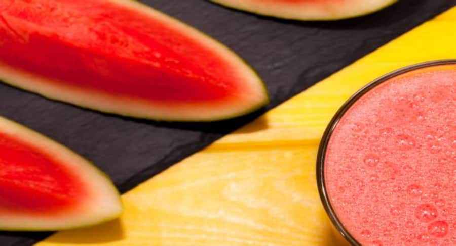 You should remove the red part and keep aside. Peel the green skin to obtain white flesh of watermelon. Cut the flesh into pieces. You should puree the red part and strain it.