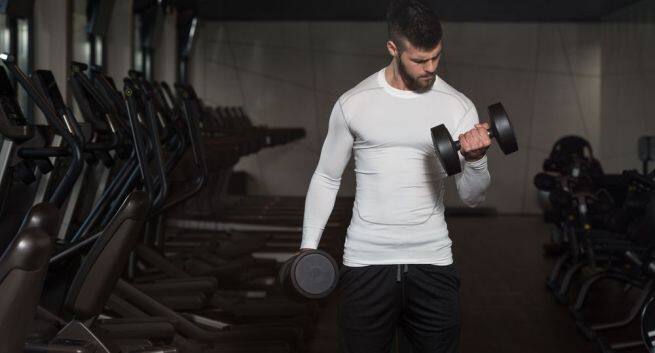 This exercise can be performed with either arm together, alternate arms or one arm at a time. Hold the dumbbells close to your body. Your palms should face forward. Then lift the dumbbells up by flexing at the elbow joint. The dumbbells should reach of the way to your shoulders.