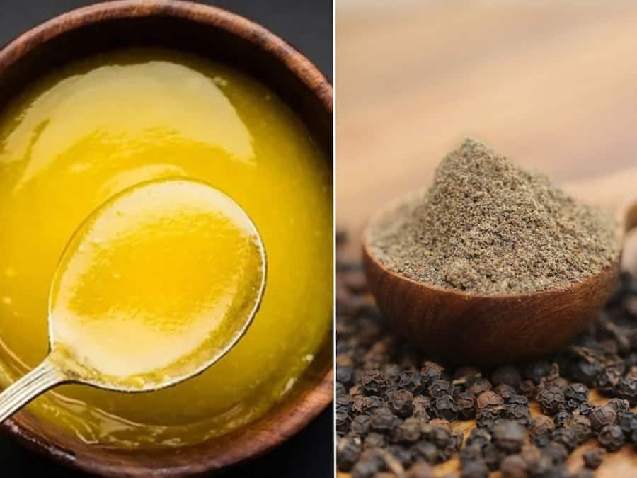 Ghee And Black Pepper Benefits: घी और काली मिर्च, दोनों पोषक तत्वों से भरपूर होते हैं। इन दोनों का सेवन सेहत के लिए बहुत फायदेमंद होता है। आमतौर पर, लोग इनका सेवन अलग-अलग करते हैं। लेकिन क्या आप जानते हैं कि घी के साथ काली मिर्च मिलाकर खाने से सेहत को कई लाभ मिल सकते हैं? जी हां, रोजाना घी और काली मिर्च का सेवन करने से शरीर की कई समस्याओं से छुटकारा मिल सकता है। इसके सेवन से इम्यूनिटी मजबूत होती है और पाचन तंत्र दुरुस्त रहता है। इसके अलावा, इसके सेवन से हृदय स्वास्थ्य को बेहतर बनाने में मदद मिल सकती है। तो आइए, जानते हैं घी और काली मिर्च खाने के फायदों के बारे में -