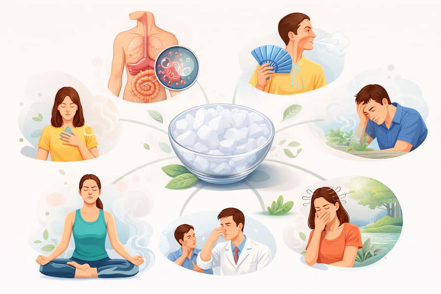 भीमसेनी कपूर की तासीर ठंडी और सुगंधित होती है, जो श्वसन मार्ग को खुला रखने में मदद कर सकती है। आयुर्वेद में पारंपरिक उपयोग में भीमसेनी कपूर को सांस लेने में कठिनाई, बलगम और सर्दी-जुकाम जैसी बीमारियों को दूर करने में फायदेमंद माना गया है।