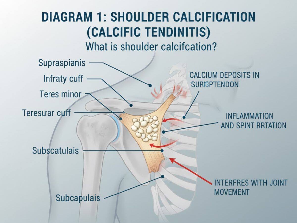 शोल्डर कैल्सीफिकेशन, जिसे मेडिकल भाषा में कैल्सीफिक टेंडिनाइटिस कहा जाता है। यह एक ऐसी स्थिति है जिसमें रोटेटर कफ के टेंडन के अंदर कैल्शियम जमा हो जाता है, जो आमतौर पर सुप्रस्पिनेटस टेंडन में होता है। ये जमाव कंधे के जोड़ की सामान्य स्लाइडिंग मूवमेंट में रुकावट डालते हैं और आसपास की मांसपेशियों और टिशू को परेशान कर सकते हैं। इसके कारण अक्सर कंधे में डीप पेन होता है, अकड़न होती है और हाथ उठाने या घुमाने में मुश्किल होती है। खासकर सिर के ऊपर की गतिविधियों के दौरान या प्रभावित तरफ सोने पर। कुछ मामलों में, दर्द अचानक हो सकता है और काफी तेज हो सकता है।
