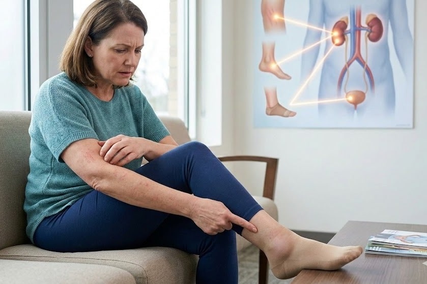किडनी के ठीक से काम न कर पाने के कारण शरीर में पानी जमा होने लगता है और ग्रेविटी के कारण ज्यादातर पानी शरीर के निचले हिस्से में जमा होता है। ऐसा खासतौर पर उन लोगों में होता है, जो दिन में काम कर रहे होते हैं, ऐसे में उनके टखने में सूजन आने लगती है। दरअसल यह सूजन टखने के आसपास के ऊतकों पानी जमा होने के कारण होता है। यह सूजन ऐसी होती है, जिसे अगर उंगली से दबाया जाए तो थोड़ी देर के लिए वहां पर निशान या उंगली के निशान का गड्ढा बन जाता है।