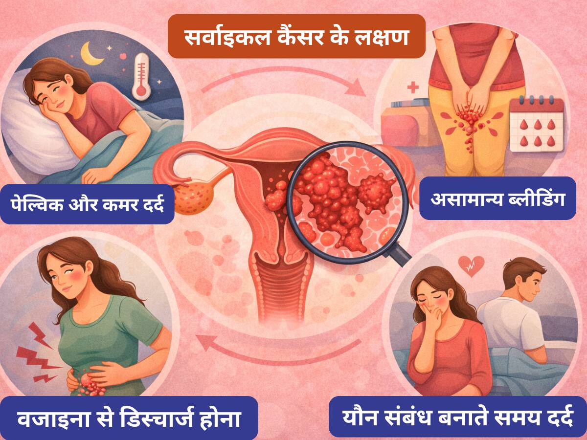 मायो क्लीनिक पर छपी रिसर्च बताती है कि शुरुआती चरणों में सर्वाइकल कैंसर के कोई स्पष्ट लक्षण नहीं दिखते, यही कारण है कि इसे 'साइलेंट किलर' भी कहा जाता है। हालांकि, जैसे-जैसे यह बढ़ता है, शरीर निम्नलिखित संकेत देने लगता है: