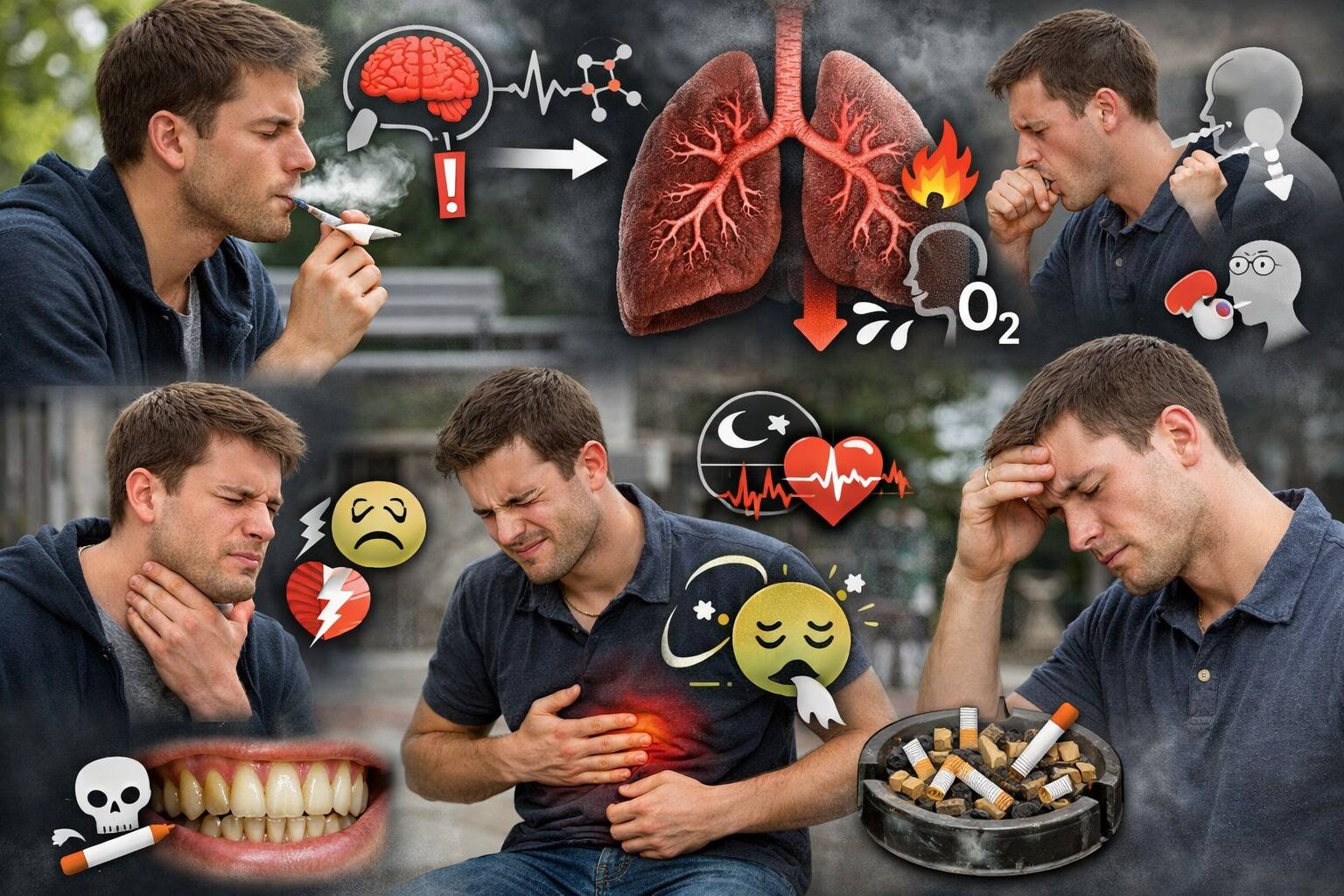 धूम्रपान का असर केवल फेफड़ों तक सीमित नहीं रहता, बल्कि यह शरीर के कई महत्वपूर्ण अंगों को भी प्रभावित करता है। लंबे समय तक धूम्रपान करने से गंभीर बीमारियों का खतरा बढ़ जाता है। सबसे बड़ा खतरा फेफड़ों से जुड़ी बीमारियों का होता है, जिसमें लंग कैंसर और क्रोनिक ऑब्सट्रक्टिव पल्मोनरी डिजीज प्रमुख रूप से शामिल है। इसके अलावा दिल और रक्त वाहिकाओं पर भी इसका नकारात्मक प्रभाव पड़ता है। कभी-कभी सिगरेट पीने का मतलब है कि शरीर को निकोटीन की आदत नहीं है और जब उसे निकोटीन मिलती है तो ब्रेन ज्यादा रिएक्ट करता है और उससे होने वाले कुछ असर इस प्रकार हो सकते हैं -
