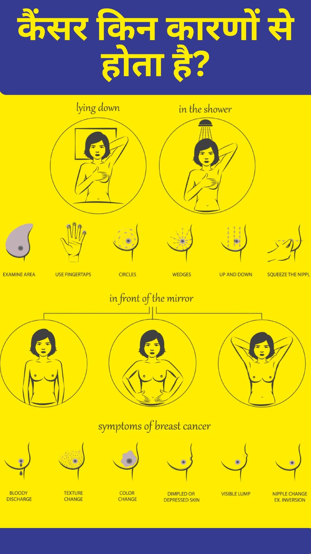 महिलाओं में स्तन कैंसर के मामले सबसे अधिक देखे जाते हैं, फिर चाहे वह जिस भी उम्र की हों। इसलिए महिलाओं को सलाह दी जाती है कि वह हर महीने स्वयं स्तन परीक्षण(Self Breast Exam) करें। वहीं अगर इस दौरान कोई गांठ, त्वचा में बदलाव या असामान्य स्राव दिखे तो तुरंत डॉक्टर के पास जाएं। बेहतर होगा कि आप हर महीने अपने पीरियड्स खत्म होने के 3-5 दिन बाद खुद जांच करें। ब्रेस्ट कैंसर से जुड़ी बातें ग्राफिक में दी गई हैं।