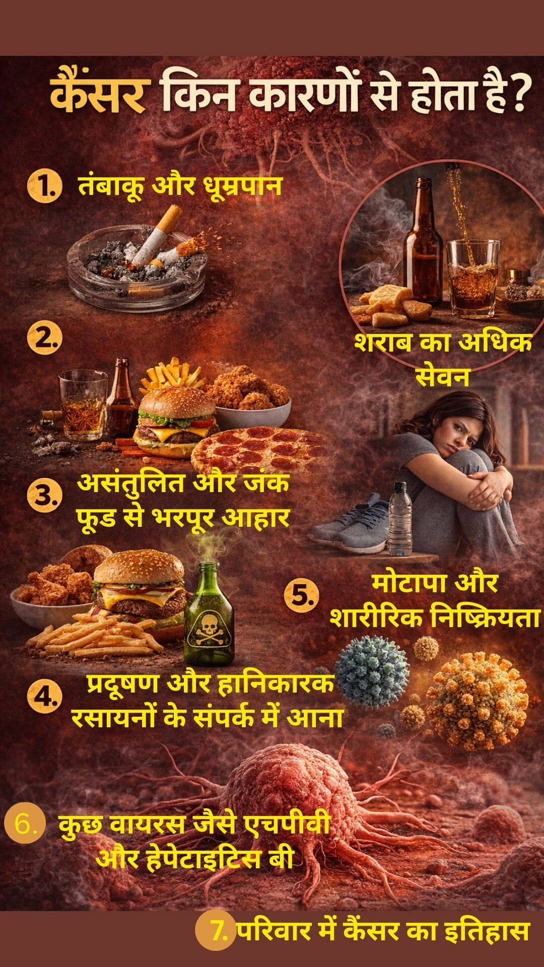 कैंसर तब होता है जब शरीर की कोशिकाएं अनियंत्रित रूप से बढ़ने लगती हैं। कैंसर होने के कई प्रमुख कारण हैं जैसे- तंबाकू और धूम्रपान, शराब का अधिक सेवन, असंतुलित और जंक फूड से भरपूर आहार, मोटापा और शारीरिक निष्क्रियता, प्रदूषण और हानिकारक रसायनों के संपर्क में आना, कुछ वायरस जैसे एचपीवी और हेपेटाइटिस बी, परिवार में कैंसर का इतिहास आदि। डॉक्टर बताते हैं, 'हर कैंसर का कारण एक जैसा नहीं होता, लेकिन जीवनशैली से जुड़े कारक सबसे बड़े कारणों में से हैं।'