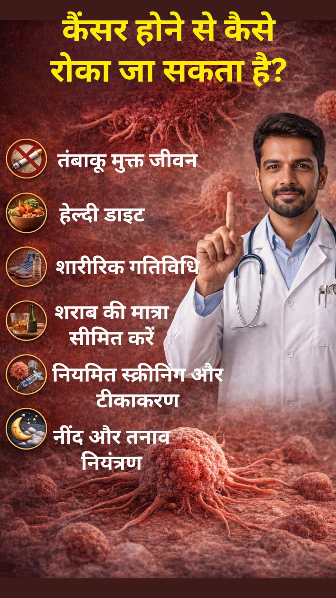 'कैंसर आज के समय में एक गंभीर बीमारी है, लेकिन अच्छी बात यह है कि कई प्रकार के कैंसर से बचाव संभव है। अगर लाइफस्टाइल में सही बदलाव किए जाएं तो कैंसर का खतरा 40–50 प्रतिशत तक कम किया जा सकता है।'
