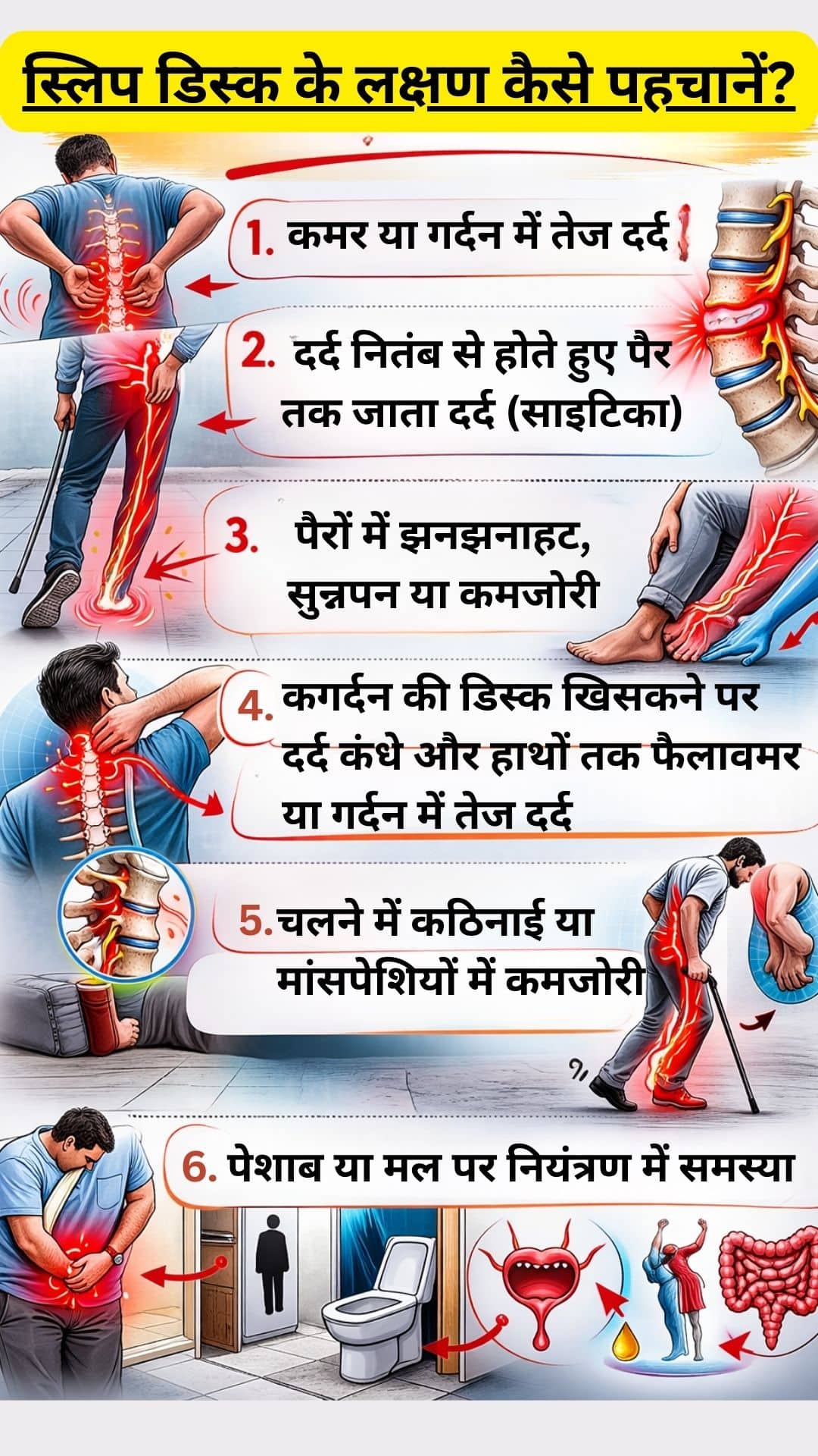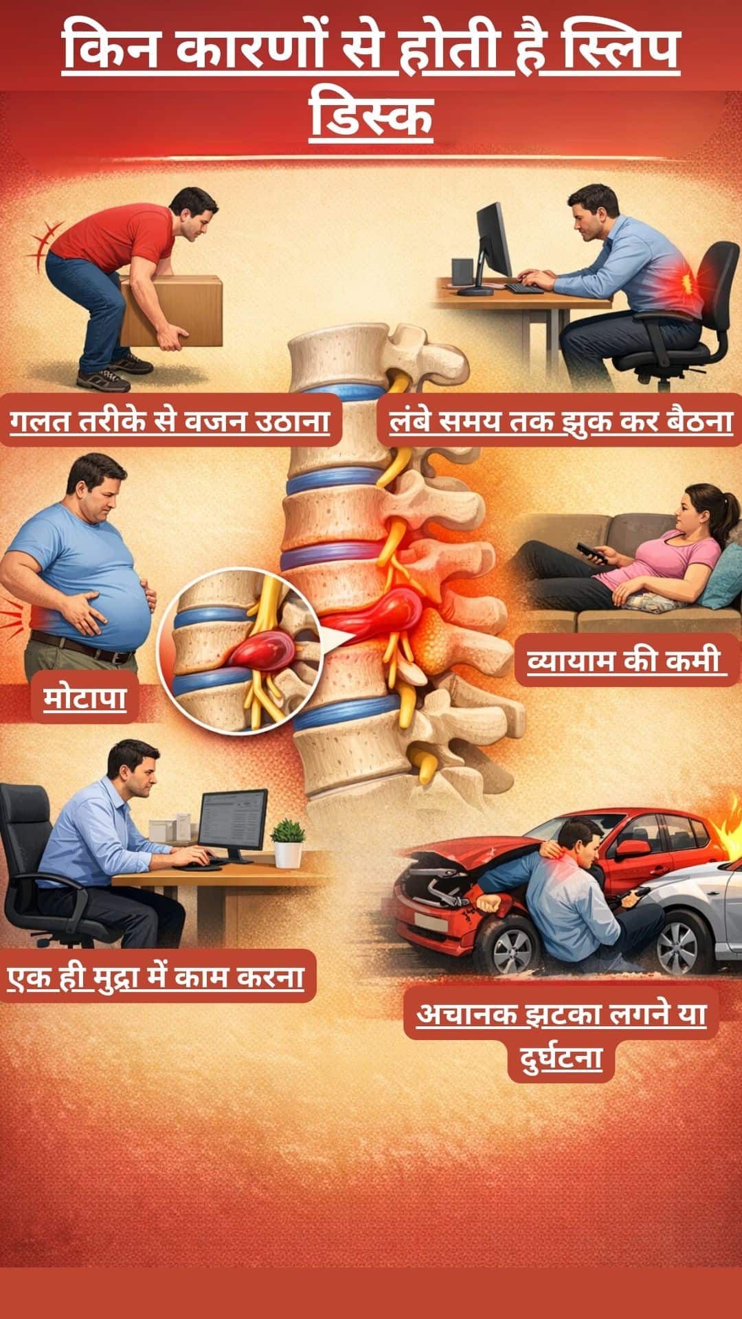 यह सभी कारण इस समस्या को बढ़ावा देते हैं। कई बार अचानक झटका लगने या दुर्घटना की वजह से भी डिस्क खिसक जाती है। आज की जीवनशैली में लंबे समय तक लैपटॉप पर बैठकर काम करना और शारीरिक गतिविधि का कम होना भी एक बड़ा कारण बनता है।