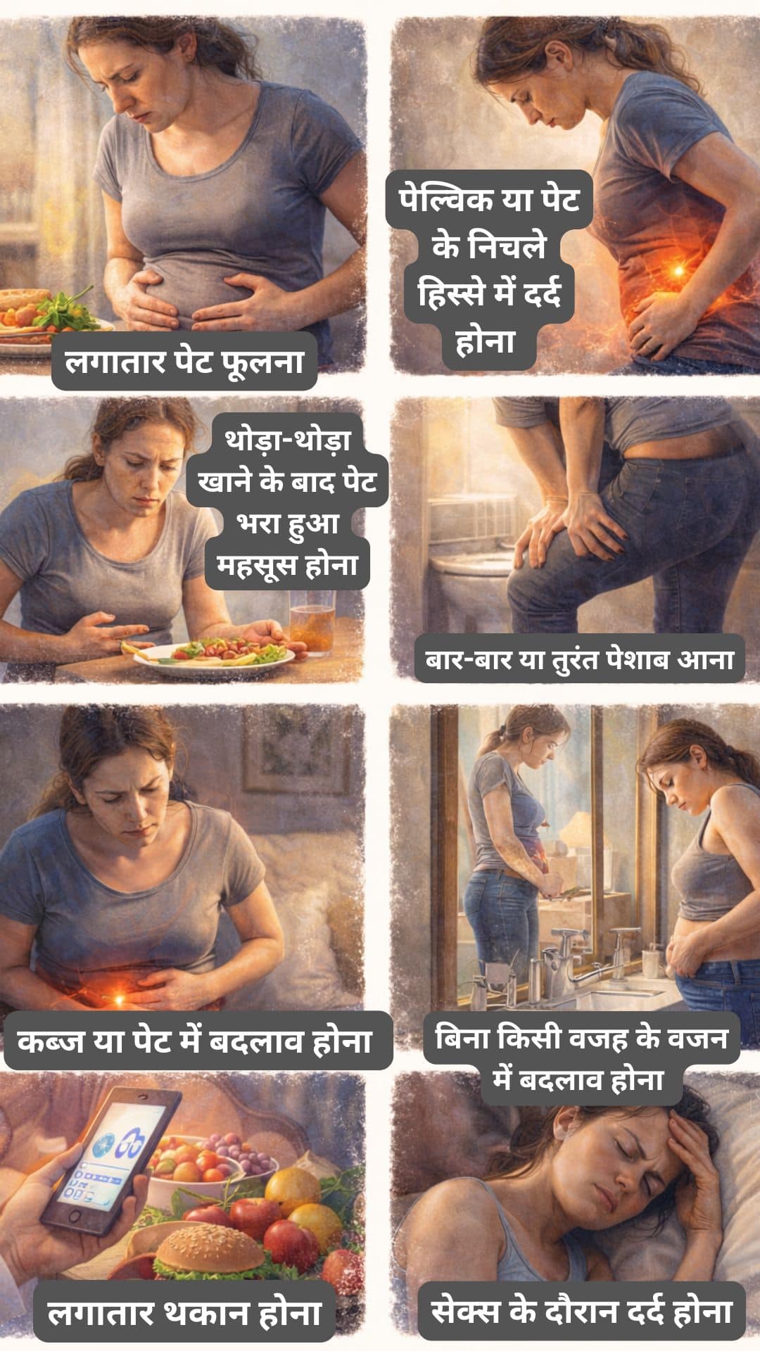 ओवेरियन कैंसर अक्सर अपने आप नजर नहीं आता है। इस कैंसर के शुरुआती लक्षण बहुत ही साधारण से लग सकते हैं। इसी वजह से लोग इन पर ज्यादा ध्यान नहीं देते हैं। सबसे जरूरी चीज यह होती है कि लगातार ऐसे लक्षणों पर नजर रखना जो अक्सर दिखे और जल्दी ना जाए। अगर निम्न लक्षण कुछ हफ्तों से ज्यादा रहें, तो इनकी जांच करवाना जरूरी है-