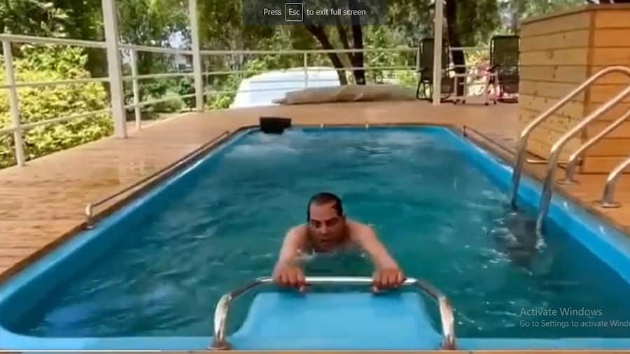 इस वीडियो को धर्मेंद्र ने अपने लोनावला के फार्म हाउस में से ट्विटर पर शेयर किया। इस वीडियो पोस्ट में अभिनेता फार्म हाउस के स्विमिंग पूल में एक्सरसाइज करते नज़र आ रहे हैं। वीडियो के कैप्शन में धर्मेंद्र ने लिखा कि, “दोस्तों, ईश्वर के आशीर्वाद और आपकी दुआओं की वजह से अब मैं अपने फिटनेस प्रोग्राम को आगे बढ़ा रहा हूं। मैंने योग और लाइट एक्सरसाइज़ेस के अलावा वाटर एरोबिक्स करना भी शुरू कर दिया है।”