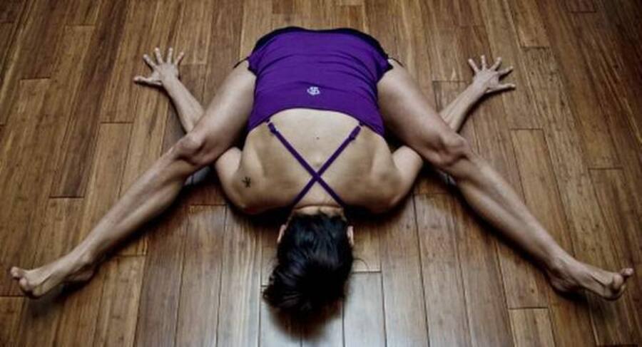 5. अब, अपने धड़ को नीचे की ओर झुकाएं। अपने माथे से फर्श को छूने की कोशिश करें।