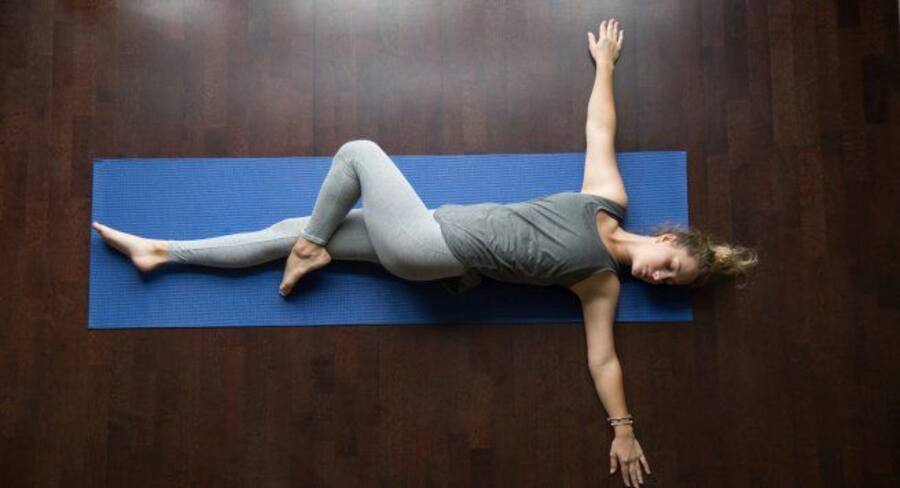 फिर, दाएं पैर को मोड़ते हुए बाएं पैर के घुटने के बगल ले आएं। दाएं हाथ को अपनी पीठ के पीछे से ले जाते हुए ज़मीन पर रखें।