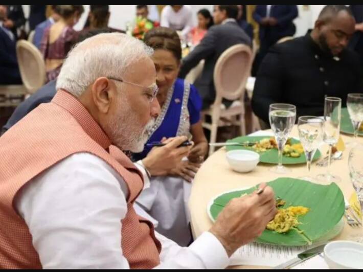 Eating food on leaves plates benefits-भारत के प्रधानमंत्री नरेंद्र मोदी (PM Narendra Modi) हमेशा से परम्पराओं और भारतीय संस्कृति से जुड़ी अच्छी चीजों के बारे में बात करते रहे हैं। हाल ही में पीएम मोदी (PM Modi) के स्वागत में त्रिनिदाद एंड टोबैगो की प्रधानमंत्री कमला प्रसाद बिसेसर ने एक डिनर रखा जहां, प्रधानमंत्री मोदी को सोहारी के पत्तों (Sohari leaves) पर भोजन परोसा गया। त्रिनिदाद एंड टोबैगो के लोगों में इन सुंदर सोहारी के पत्तों पर भोजन करने (Eating food on sohari leaves) की बहुत अधिक अहमियत है। यह ठीक वैसा ही है जैसे भारत में केले के पत्तों, बरगद, पलाश और महुआ के पत्तों की पत्तल में खाना परोसा (Pattal mein khana kyun khate hain) जाता है।