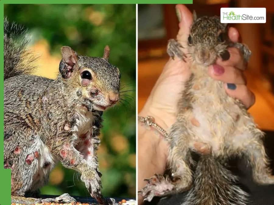 Squirrels infected by the leporipoxvirus appear to have wart-like tumours that ooze fluid. According to wildlife experts, the skin condition often clears up on its own, but in severe cases, the growths can affect internal organs and lead to death.