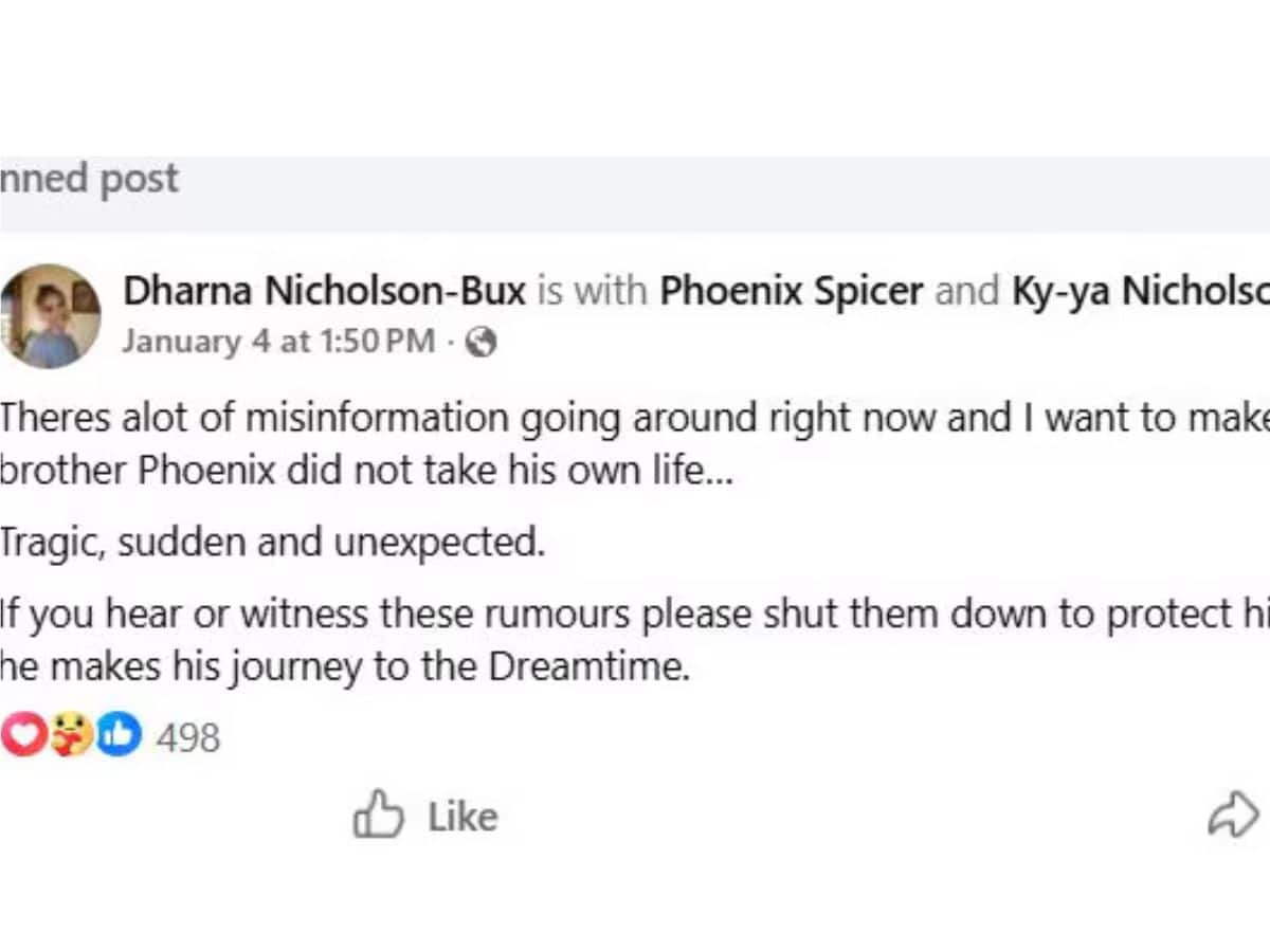 "There's a lot of misinformation going around right now and I want to make it VERY CLEAR, our brother Phoenix did not take his own life," Dharna Nicholson-Bux said in the post. She went on to add, "Tragic, sudden and unexpected. If you hear or witness these rumours please shut them down to protect his heart and dignity while he makes his journey to the Dreamtime."