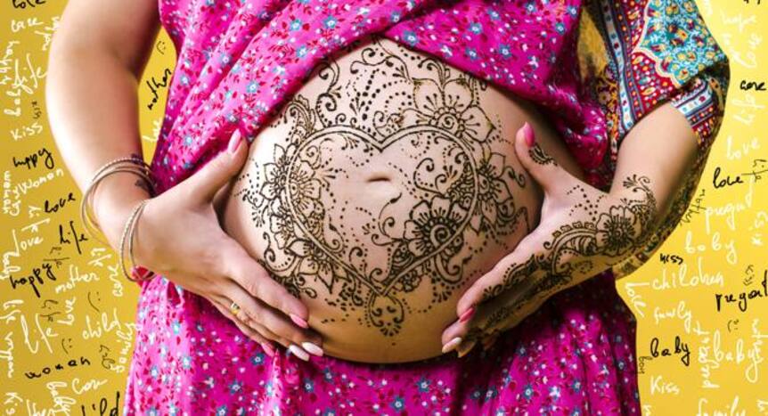 A tribal, floral pattern is classic! This pattern looks beautiful and signifies the life blooming inside you.